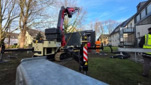 In solchen Fällen ist unser neuer Raupenkran oftmals die Lösung. Er wird auf einem kompakten LKW zum Einsatzort gebracht und fährt direkt oder auf Kunststofffahrplatten auf das Grundstück. In Kombination mit unserer Raupenplattform kommt die Ware zum Kran und kann mit kurzer Ausladung platziert werden. Es ist keine Straßensperrung und kein Großkran erforderlich. Bei stark bewachsenen Flächen müssen in den meisten Fällen dann auch keine Bäume gefällt werden, da der Kran die Last nicht durch die Baumkrone heben muss.